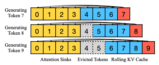 基于上面的現(xiàn)象,StreamingLLM中保留了一定的初始Token,通過這種Attention sink的方案穩(wěn)定Attention計算。之后通過Rolling KV的方式保留一定數(shù)量的最新Token。