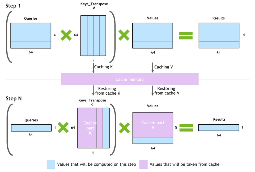Step 1:正常的Attention計算,之后將K矩陣和V矩陣的結(jié)果緩存下來KcacheVcache。