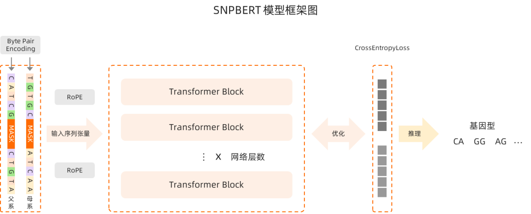 SNPBERT 模型通過 Byte Pair Encoding 的 token 詞匯本進行編碼,并在此基礎(chǔ)上采用 RoPE(Rotary Position Embedding)對 token 位置進行編碼;基于 Transformer 框架,創(chuàng)新性地引入父系/母系雙掩碼自監(jiān)督預(yù)訓(xùn)練,實現(xiàn)等位基因級的并行堿基預(yù)測;并分別編碼父系與母系兩條單倍型序列,在同一位置同步掩碼并預(yù)測堿基,解碼后形成精準(zhǔn)的基因型推斷;同時基于八張?zhí)魽I加速卡的多卡并行訓(xùn)練和 FlashAttention 算子庫,提升模型訓(xùn)練速度。