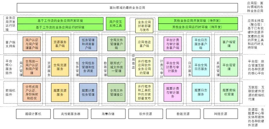 超算互聯(lián)網(wǎng)是指基于多個國家級超級計算中心的資源,通過高速網(wǎng)絡(luò)實現(xiàn)資源的互聯(lián)互通與資源共享,形成國家高性能計算核心資源網(wǎng)。其上集成了研發(fā)資源管理與任務(wù)調(diào)度軟件,形成領(lǐng)域應(yīng)用平臺搭建技術(shù)體系。并在復(fù)雜力學(xué)體系與量子物理體系、生物與材料、環(huán)境治理與災(zāi)害防治等多個重點領(lǐng)域進行應(yīng)用資源集成與服務(wù)集成,建設(shè)領(lǐng)域應(yīng)用平臺并開展應(yīng)用示范,為國家實驗室等大型研究機構(gòu)提供以數(shù)值模擬為主、兼顧數(shù)據(jù)分析和智能計算的科研基礎(chǔ)設(shè)施服務(wù)。